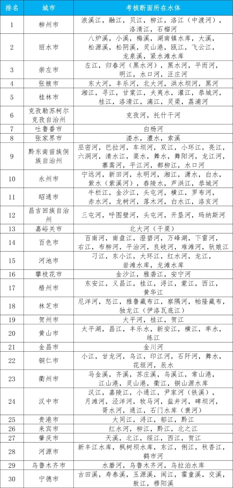 1—12月,全國(guó)地級(jí)及以上城市中,柳州市、麗水市和崇左市等30個(gè)城市國(guó)家地表水考核斷面水環(huán)境質(zhì)量相對(duì)較好(從第1名至第30名),五家渠市、商丘市和開封市等30個(gè)城市國(guó)家地表水考核斷面水環(huán)境質(zhì)量相對(duì)較差(從倒數(shù)第1名至倒數(shù)第30名),見附表1—2。