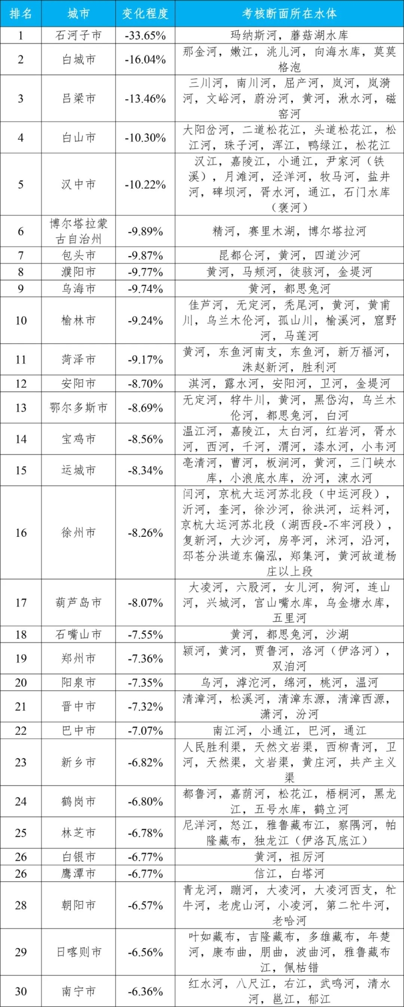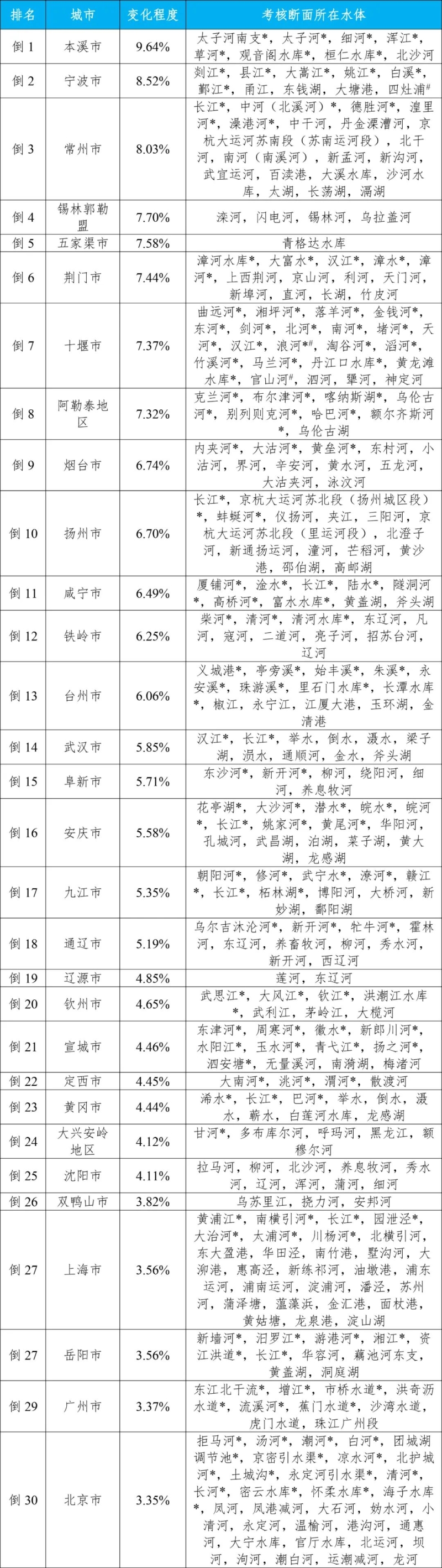 石河子市、白城市和呂梁市等30個(gè)城市國(guó)家地表水考核斷面水環(huán)境質(zhì)量變化情況相對(duì)較好(從第1名至第30名),本溪市、寧波市和常州市等30個(gè)城市國(guó)家地表水考核斷面水環(huán)境質(zhì)量變化情況相對(duì)較差(從倒數(shù)第1名至倒數(shù)第30名)。見附表3—4。